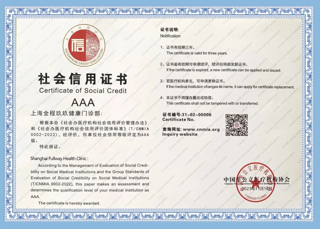近期,上海鹏欣集团旗下上海全程玖玖健康门诊部接受了中国非公医疗机构协会评价专家组的信用与能力的续评考核,收获了一致认可!喜获中国非公立医疗机构协会“社会信用评价AAA级机构”及“医疗质量服务能力五星级医疗机构”两项殊荣!