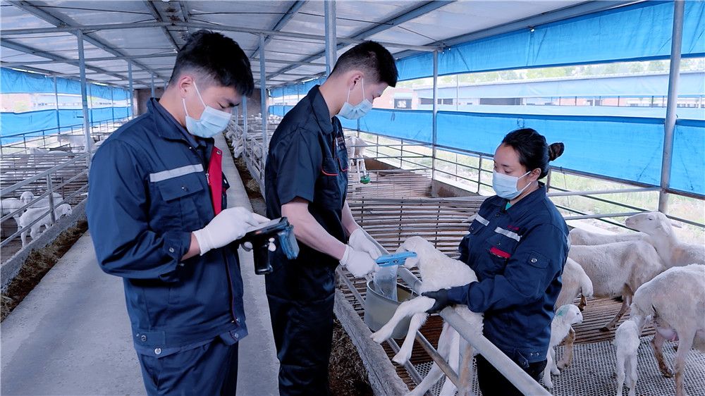 工作人员在给羊崽佩戴电子耳标,进行数字化管理